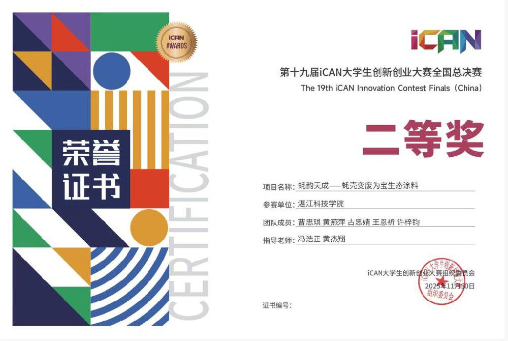 近日,第十九届iCAN大学生创新创业大赛全国总决赛在杭州国际博览中心圆满落幕。从大湾区赛区的激烈角逐到全国总决赛的巅峰对决,我校学子一路披荆斩棘,捷报连连。学校7支队伍在大湾区赛区斩获1金4银2铜的优异成绩,冯浩正、黄杰翔老师荣获大湾区赛区优秀指导老师。其中,由校团委“新启计划”孵化的“蚝韵天成”团队,从全国众多参赛队伍中突围晋级全国总决赛,最终斩获全国总决赛创新赛道二等奖,以实力彰显了湛科学子的创新精神与创业风采。